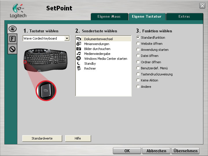 Auf den ersten Blick scheint die Tastatur nur wenige Sondertasten zu haben. Dem ist allerdings nicht so, da alle Funktionstasten mit einer weiteren Sonderfunktion ausgestattet sind. Es empfiehlt sich, die beiliegende Software zu installieren, um alle Funktionen der Tastatur nutzen zu können. Auf der linken Seite befinden sich mehrere Tasten, die standardmäßig zum Zoomen und für den Flip-3D-Modus unter Windows Vista gedacht sind. Unter Windows XP bietet diese Taste einen einfachen Dokumentenwechsel, wie wir ihn auch schon von Logitech-Mäusen kennen, bei denen ein neues Fenster aufgeht, um das gewünschte Programm auswählen zu können. Am rechten oberen Eck befindet sich eine Taste für den Rechner und eine weitere, um den PC in den Energiesparmodus zu versetzen. Neben den Tasten zur Steuerung des Mediaplayers befinden sich an der Oberseite Tasten für die Windows Vista Minianwendungen, die Fotogalerie und das Media Center. Wie bereits erwöhnt, besitzen die Funktionstasten allesamt weitere Funktionen, die durch gleichzeitigen Druck der Fn-Taste abrufbar sind. Besonders hervorzuheben ist hier die Taste zum Auswerfen von CDs und DVDs, wie wir sie vom Apple Macintosh kennen. Auf die Software selbst werden wir aber noch später eingehen. Nach dem Anstecken des USB-Kabels ist die Tastatur sofort betriebsbereit.