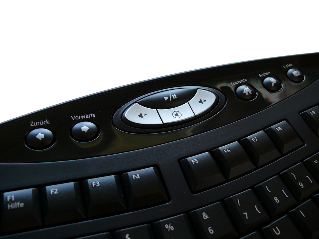 Mit Sondertasten ist man bei dieser Tastatur sparsam umgegangen, jedoch sind alle ohne Installation eines Treibers unter Windows XP und Vista zugünglich. Auf der rechten Seite über dem Nummernblock befindet sich eine Taste für den Windows-Rechner. Auf der Oberseite sind die Mediaplayer-Tasten angeordnet. Anzumerken ist hier, dass auf Tasten für den vorigen oder nächsten Titel der Wiedergabeliste verzichtet worden ist, lediglich Lautstärke und Wiedergabe/Pause sind vorhanden. Daneben befindet sich je eine Vorwärts- und Zurück-Taste sowie Tasten für E-Mail, Browser und die Suchfunktion. Die Tastatur wird per USB mit dem PC verbunden.