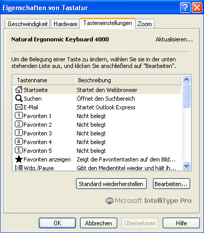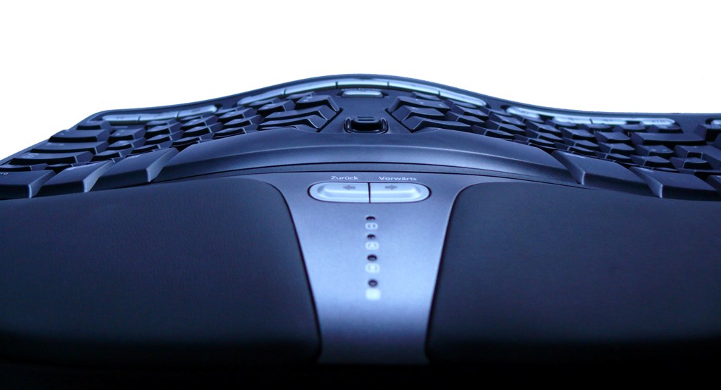 Diese Tastatur fordert durch die oben genannten Änderungen mit Abstand die größte Umgewöhnung für den Benutzer. Erfreulicherweise sind alle Tastenblöcke abgesehen vom Haupttastenblock im Standardlayout gehalten. Die F-Tasten sind allerdings nicht wie üblich in Vierergruppen angeordnet, sondern in zwei Gruppen zusammengefasst, die jeweils rechts und links der Mitte sitzen. Über dem Nummernblock gibt es eine weitere erfreuliche Neuerung. Hier sind vier herkömmliche Tasten angebracht, die die Funktionen von Klammern, Backspace und dem Gleichheitszeichen bieten und erweitern den Nummernblock so um sinnvolle Funktionen. Doch die Tastatur hat noch einiges mehr an Sondertasten zu bieten. Zwischen den zwei Haupttastenblöcken befindet sich ein Zoom-Slider und unter der Leertaste sind Tasten für Vor und Zurück angeordnet. Zwischen den F-Tasten befindet sich eine Favoritentaste mit fünf weiteren, frei belegbaren Tasten für diverse oft verwendete Dokumente oder Ähnliches. Links daneben befinden sich die bekannten Tasten für den Browser, die Suche und das E-Mailprogramm. Rechts der Favoritentasten liegen die Tasten zur Steuerung des Mediaplayers. Hier fehlen allerdings wieder wie auch schon bei der ersten Microsoft-Tastatur in unserem Test die Tasten für die Steuerung der Wiedergabeliste. Der Windows-eigene Rechner hat auch auf dieser Tastatur eine separate Taste spendiert bekommen. Weiterhin hat jede der Funktionstasten eine zusätzliche Sonderfunktion, wie wir es auch schon von der Logitech Wave Tastatur kennen. Diese lassen sich mit Hilfe der Zusatztaste neben der F12-Taste permanent ein- und ausschalten.