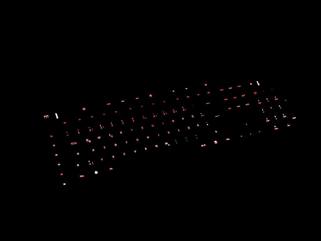 Beim Tastaturlayout hat Microsoft nun auch die Escape-Taste wieder an das Standardlayout angepasst. Das hat Microsoft aber nicht daran gehindert auch bei dieser Tastatur wieder die rechte Windows-Taste zu entfernen und die Alt-Gr-Taste zu verschieben. Wir hoffen, dass dies bei Nachfolgemodellen nicht mehr der Fall ist. Am oberen Rand befinden sich wieder Tasten zur Mediaplayersteuerung und Tasten für Lautstärke und die rote Beleuchtung, die in drei Stufen aktiviert sein kann. Bei der SideWinder X4 werden nur die Buchstaben und Zeichen selbst beleuchtet, der Hintergrund ist unbeleuchtet. In unserem Test war die Beleuchtung bei jedem Start des Computers aktiviert, alle Tasten auch in Dunkelheit sofort erkennbar. Zu diesen Tasten kommt noch eine Taste um Makros aufzuzeichnen und eine Taste um zwischen den drei möglichen programmierbaren Tastaturprofilen zu wechseln.