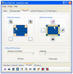 Mit der Software GyroTools GO gibt Gyration dem gesamten Set ein sehr mächtiges Werkzeug an die Hand und geht dabei sehr stark auf die Individualisierung der Maus ein. So findet man am unteren Ende der GyroTools GO Software eine Palette fertiger Funktionalitäten die man via Drag´n´Drop "auf die Maus ziehen kann". Beispiel: Die Registerkarte "Bewegungen" bietet die Möglichkeit bis zu acht verschiedene Aktionen in verschiedenen Himmelsrichtungen zu definieren. Durch das Einrasten der Gyro-Funktion und das anschließende Blockieren der Mitteltaste stehen diese Funktionen nun zur Verfügung und können durch das Bewegen der Air Mouse in die jeweilige Richtig benutzt bzw. aktiviert werden - simple Programmstarts sind ebenfalls möglich. Ein weiterer wichtiger Bestandteil der Software ist der Punkt "Hotspots": Hier lassen sich bestimmte Bildschirmbereiche definieren in denen wiederum vordefinierte Aktionen ausgeführt werden sollen. Zum Beispiel kann man in der oberen linken Ecke des Bildschirms ein Quadrat von 50x50 Pixel für den Start des persönlichen Browsers festlegen. Eine weitere Option ist das Textmarker-Tool, mit welchem man Dinge in verschiedenen Farben auf dem Bildschirm markieren kann. Durch die zahlreichen Möglichkeiten wird die Air Mouse von Gyration zum echten Kracher bei Präsentationen!
