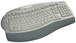 Kurz und bündig: Das Wireless Comfort Keyboard entspricht, abgesehen von der Tastenbelegung am linken Rand der Tastatur, dem bereits auf der vorherigen Seite beschriebenen Wireless Photo Keyboard des Wireless Optical Desktop 5000 Sets. So finden wir auch hier die F-Tasten mit doppelter Funktionalität (v.l.n.r.: Hilfe, Rückgängig, Wiederherstellen, Neu, Öffnen, Schließen, Antwort, Weiterleiten, Senden, Rechtschreibprüfung, Speichern, Drucken), das Multimedia- und Internetfeld am oberen Ende und weitere Sondertasten ("Photo Center") links. Letztere bilden technisch betrachtet den einzigen Unterschied zum Photo Keyboard, da wir hier nicht die mit Microsoft Foto 2006 verknüpften Funktionen Bibliothek (zeigt Eigene Bilder in Foto 2006), Bearbeiten, Senden (via E-Mail), Drucken unf Diapräsentation, sondern Startseite (Browser), Kalender, E-Mail, Messenger und Eigene Dateien vorfinden. Der praktische Schieberegler für dynamischen Zoom hat man beibehalten. Alles in Allem sind die beiden Tastaturen sehr stark miteinander verwandt und entstammen dem selben Designkonzept, was auch äquivalente Stärken und Schwächen bedeutet - wie auch beim Photo Keyboard ist hier das gleichzeitige Betätigen von maximal nur drei Tasten möglich!