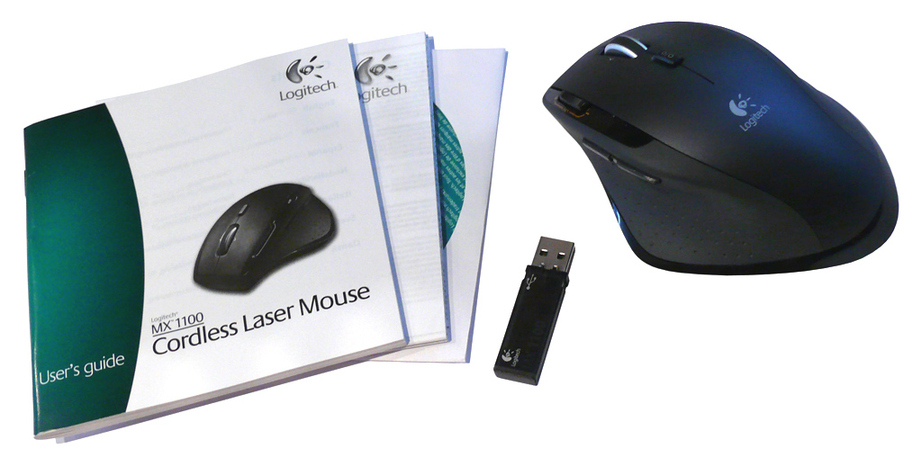 Die kabellose Maus für Rechtshänder kommt mit einer Vielzahl an Tasten ins Haus. Neben dem, schon von der MX Revolution bekannten, 4-Wege-MicroGear-Scrollrad, befinden sich insgesamt 10 Tasten auf der Maus. Sie kann wahlweise mit einer oder zwei Batterien des Typs AA betrieben werden. Dies hat Einfluss auf Gewicht und Akkulaufzeit, auf die wir aber noch später eingehen werden. Weiters ist sie in zwei Versionen erhältlich, einerseits in der von uns getesteten normalen Version für den Batteriebetrieb, andererseits in der akkubetriebenen (1 Stk. AA-NiMH-Akku) Version, wie sie dem Logitech Cordless Desktop Wave Pro beiliegt. Diese Version trägt den Namen MX 1100R und ist bei unserem Partner Geizhals unter dem Namen Logitech OEM MX 1100R zu finden. Der Unterschied zur normalen Version ist ein beiliegendes USB-Kabel mit dem der Akku des Typs AA im Betrieb in der Maus aufgeladen werden kann. Der USB-Empfänger misst etwa 50 x 15 x 7 mm, wir vermissen hier die Abmessungen des Nano-Empfängers von Logitechs VX Nano.