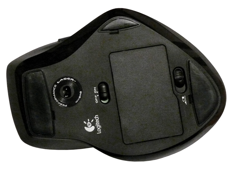 Technisch gesehen setzt die MX 1100 wieder auf einen Lasersensor der von 400 bis 1600 dpi in 200-dpi-Schritten eingestellt werden kann. Das Umschalten zwischen den zwei, im Treiber eingestellten, Stufen lässt sich wie bereits erwähnt an der Oberseite der Maus durchführen. Auf der Unterseite des Nagers kann man gut die drei Mausfüße erkennen, die ein äußerst leichtgängiges Gleiten ermöglichen. Auffallend ist auf der Unterseite der Maus ebenfalls die ungewöhnliche Positionierung des Lasers im vorderen Bereich. Dies fordert eine kurze Umgewöhnungsphase zu anderen Mäusen. Hat man sich aber einmal daran gewöhnt, steht dem gewohnten Arbeitsfluss aber nichts mehr im Wege. Ungewohnt ist außerdem das relativ hohe Gewicht der Maus: Inklusive beider AA-Batterien wiegt die MX 1100 etwa 178 Gramm, mit nur einer bringt sie es auf 154 Gramm.