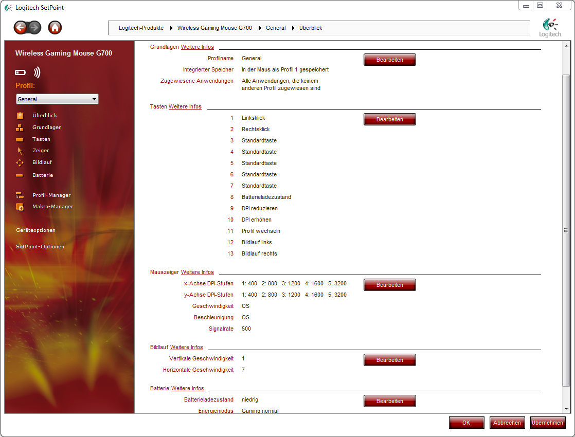 In der SetPoint-Software offenbarten sich uns die Logitech-üblichen Einstellungsmöglichkeiten. In sieben einzelnen Untermenüs können umfangreiche Einstellungen vorgenommen werden. Im ersten lassen sich die Profilnamen mit Beschreibung definieren. Auch lässt sich der integrierte Speicher der Maus hier mit Profilen füllen. Insgesamt lassen sich 5 Profile auf der Maus speichern, standardmäßig sind 3 definiert. Diese sind "General", ein Allroundprofil, "Gaming", ein Spieleprofil und "Productivity", ein Arbeitsprofil, welches auf Energiesparen ausgelegt ist. Im zweiten Menü lassen sich die 13 Tasten definieren. Mit der Auswahl an Funktionen sollte jeder Benutzer zufriedengestellt werden. Mit Makros ist die Liste noch stark erweiterbar.