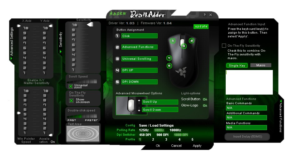 Hinsichtlich des Aufbaus und der Gestaltung des Treibers erwarten uns gegenüber dem Treiber der Habu keine Änderungen. Die Farbgebung ist wie üblich schwarz-grün gehalten, die Schrift ähnlich klein. Betrachtet man sich die Einstellungen im Einzelnen, so fällt auf, dass die Death Adder im Grunde mit den gleichen treiberseitigen Funktionen aufwarten kann wie die Habu. Neben Abtastrate und Auflösung bietet der Treiber eine Menge weiterer Funktionen wie die Verstellung der Empfindlichkeit, die Zuweisung von Anwendungen zu den Tasten u.a.m. Die Tasten lassen sich in dieser Hinsicht relativ frei belegen. Es können darüber hinaus Makros mit bis zu 16 Zeichen zugewiesen werden. Die On-the-fly-Sensivity fehlt ebenso wenig wie die Möglichkeit, die Beleuchtung der Maus abzuschalten. Ob letzteres nötig ist, sei dahingestellt, aber da es Nutzer geben mag, die sich durch das pulsierende Logo gestört fühlen, ist das sicherlich nicht völlig fehl am Platze. Unserer Erfahrung nach hat es sich bewährt, die Verstellung der Auflösung in Spielen auf die beiden Daumentasten zu legen und dem Rad die On-the-fly-Sensivity zuzuweisen. Bei der Verstellung der Auflösung kann ausgewählt werden, ob man durch Drücken der Tasten die einzelnen Stufen durchschalten will oder ob man einen festen Wert definieren möchte. Somit sollte sich hier als für alle Belange etwas finden. Wer auf den Daumentasten lieber Spielefunktionen liegen hat, muss dem Treiber natürlich die entsprechende Taste zuweisen. Alles in allem lässt der Treiber der Death Adder keine Wünsche offen – von einer besseren Übersichtlichkeit einmal abgesehen.