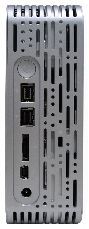 Im Inneren dessen befindet sich bei der Studio Edition eine Western Digital Caviar GP mit 16 MB Cache und standardmäßigen 7200 Umdrehungen pro Minute. Nun nicht mehr rund, sondern modern in Langlochform, kommt die neue, schmale Statusanzeige an der Front daher, die hier aber keinerlei Bedienelement mehr darstellt. Letzteres wurde nun über den Anschlüssen auf der Rückseite angeordnet.