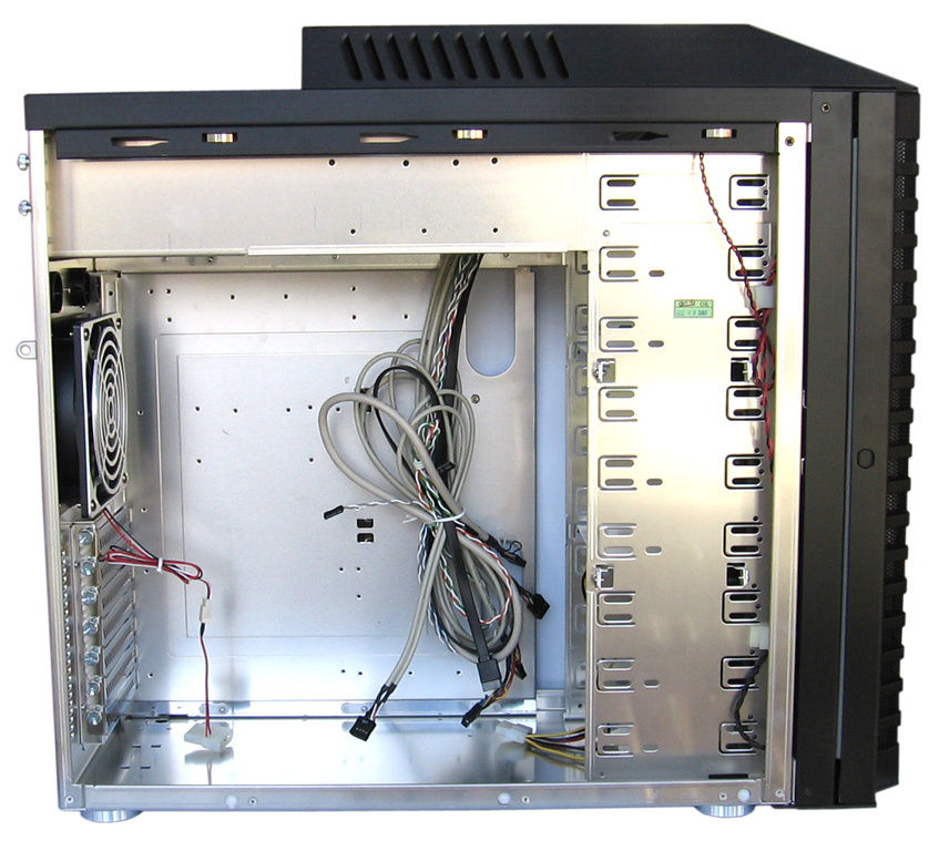 Das Innere des Lian Li PC-P60 Armorsuit bietet auf den ersten Blick keine Besonderheiten, da man auf das bewährte und klassische ATX-Design bei der Anordnung der Komponenten gesetzt hat. Die wichtigsten Eckpunkte sind dabei das Netzteil im oberen Bereich, das Mainboard in üblicher Position und die Laufwerke in 3,5 und 5,25 Zoll Ausführung im vorderen Bereich des P60. Bei der Installation von Laufwerken und sonstigen Front-Modulen lässt einem Lian Li möglichst freie Hand, da der Festplattenkäfig in seiner Einbauhöhe variiert werden kann. Dazu wurden die insgesamt neun 5,25 Zoll Schächte in drei Bereiche zu jeweils drei Montageplätzen aufgeteilt. Dadurch hat der Benutzer die Möglichkeit die Festplatten (maximal drei 3,5 Zoll Laufwerke) ganz oben, in der Mitte oder ganz unten im Gehäuse zu montieren. Dies kann sich vor allem dann als praktisch erweisen, wenn man beispielsweise den PC auf dem Schreibtisch stehen hat und die optischen Laufwerke aus Gründen der besseren Erreichbarkeit nicht wie üblich oben, sondern unten im Gehäuse installiert werden sollen. Alles in Allem stehen somit entweder neun (falls der Festplattenkäfig nicht benutzt wird) oder sechs 5,25 Zoll und bis zu drei 3,5 Zoll Schächte für die Montage von entsprechenden Komponenten bereit. Wie bereits auf der vorherigen Seite erwähnt, bietet das Lian Li PC-P60 Armorsuit leider keine Möglichkeit externe 3,5 Zoll Laufwerke zu verbauen.