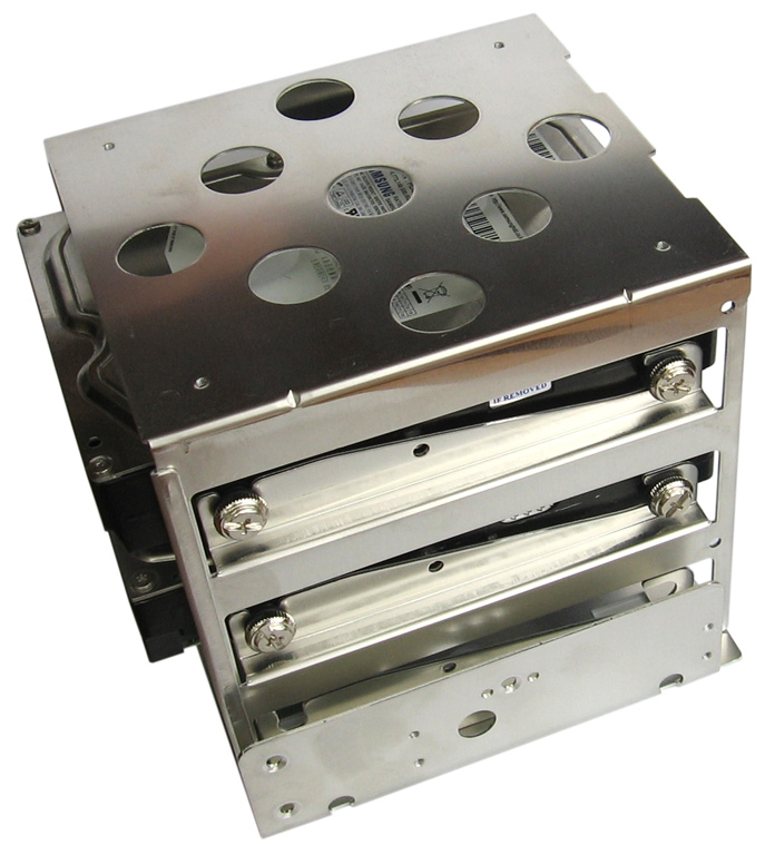 Der Festplattenkäfig bietet wie oben erläutert drei Montageplätze für 3,5 Zoll Festplatten und wird mithilfe von vier Schrauben fest in einem von drei möglichen Posititionen befestigt. Die Festplatten selbst werden anschließend nur festgeklickt und nicht noch einmal separat mit dem Käfig verschraubt. Hierzu dient ein System aus vier speziellen Rändelschrauben und jeweils einem kleinen Gummiring mit seitlichem Profil: Hat man die vier Halterungen, bestehend aus Rändelschraube und Gummiring, an der Festplatte angebracht, kann diese mit einem einfachen Handgriff im Käfig verankert werden. Dadurch sind die drei Laufwerke sowohl fest im Gehäuse installiert als auch gleichzeitig durch die Gummiringe von ihm entkoppelt und übertragen keine Schwingungen. 5,25 Zoll Komponenten werden ganz herkömmlich mit den mitgelieferten Schrauben befestigt und sind damit standardmäßig nicht vom übrigen System entkoppelt. Hier muss der Benutzer selbst Abhilfe schaffen.