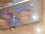 Hier kommen wir nun endlich zu der genialen blauen Kaltlicht Kathode, die oben drauf noch soundsensitiv ist. Das heist, wenn man Musik hört oder die Festplatte laut genug ist, blinkt die Kaltlicht Kathode auf, was einen wirklich genialen Effekt ergibt! Diese soundsensitiv Funktion kann man aber auch abstellen, gerade für eher ruhigere Momente wo man doch lieber nur einen schonen blau beleuchteten PC möchte. Wir haben hier noch ein kleines Video aufgenommen, in welchem sie die Kathode in Aktion sehen (Video). Da die Kaltlicht Kathode nicht das einigste Extra ist, kommen wir hier nun zum mitgelieferten Gehäuselüfter...