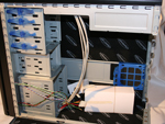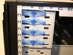 Jetzt zur Ausstattung die standardmäßig in jedem Gehäuse vorgefunden werden kann. Das Gehäuse kann insgesamt elf Laufwerke unterbringen, davon sind zwei für Floppylaufwerke vorgesehen, oder als Erweiterungungsslot für einen internen USB-Hub oder ähnlichem. Für CD- und DVD-Laufwerke stehen dem Käufer insgesamt vier Slots zur Verfügung, betrachtet man den Tower von Innen, wird deutlich, dass diese Art von Gehäuse für den geräuscharmen Betrieb ausgelegt ist - drei weitere interne 5,25 Zoll Laufwerksschächte lassen sich mit dem HD-Silencer verbinden. Leider fehlt es an 3,5 Zoll Laufwerksschächten, da sich neben den zwei Floppyeinbaumöglichkeiten nur noch eine weitere ungedämmte Festplatte ohne Adapter in den Tower integrieren lässt.