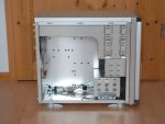 Das innere des Gehäuses zeigt das bekannte Lian Li Chassis der PC-6er Serie. Die serienmäßig eingebauten silent Gehäuselüfter sind gut platziert: Einer direkt hinter der CPU und zwei in der Gehäusefront welche die Festplatten belüften und frische Luft in das Gehäuse blasen. Die vorderen Lüfter saugen ihre Luft durch einen Luftschacht vom Fußboden auf - hier ist zum Schutz ein mit Thumb-Screws zu entfernendes Schutzgitter mit Staub-Filter angebracht. Diese ganze Konstruktion ist bedingt durch die gesamte Frontgestaltung und dient neben der Optik auch der Geräuschreduzierung. Leider viel beim PC-6070 anders als bei den anderen Gehäusen der PC-6er Reihe die Lian Li typische Lüftersteuerung weg. Auch ist es nicht mehr möglich die Front abzunehmen. Die Gehäuse-Beleuchtung besteht aus extrahellen LEDs für die Power- und HDD Anzeigen in den Farben blau und rot...