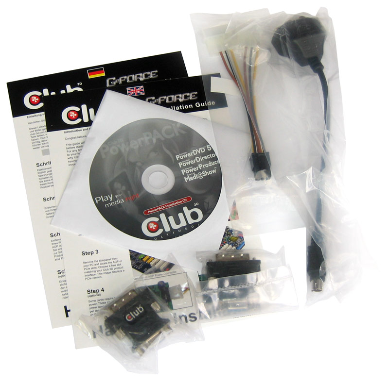 Mit der CGNX-GTS866 bietet das Unternehmen Club-3D eine GeForce 8600 GTS Grafikkarte im Referenzdesign an. Die Platine kommt mit einem umfangreichen Lieferumfang daher, der sich aus folgenden Komponenten zusammen setzt: zweisprachiger Installation-Guide (Englisch und Deutsch), CD inklusive Treiber und Programme (PowerDVD, PowerDirector, PowerProducer und Medi@Show), TV-Breakout-Box für RGB-Komponenten und S-Video, Stromadapter (4-Pin auf PCIe), zwei DVI/VGA-Adapter. Club-3D verzichtet bei der Zusammenstellung des Lieferumfangs auf die Beigabe eines Spiels, wertet die Karte aber durch das CyberLink-Softwarepaket aber in Sachen Multimediatauglichkeit deutlich auf. Was die Hardware zu bieten hat, lesen Sie im folgenden Abschnitt...