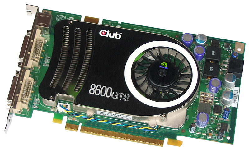 Wie erwartet basiert die Club-3D-Grafikkarte auf Nvidias G84(-400)-Grafikchip, der sich wiederum der Rechenleistung von 32 Stream-Prozessoren bedienen kann. Bei den Frequenzen hielten sich die Entwickler an die Vorgaben von Nvidia: 675 MHz Chip- bzw. 1,45 GHz Shader-Takt. Beim verbauten GDDR3-Speicher mit einem Gesamtvolumen von 256 MB handelt es sich um BGA-Chips aus dem Hause Samsung. Die RAMs mit der Seriennummer K4J52324QE-BJ1A arbeiten bei einer Versorgungsspannung von 1,9 Volt, fassen jeweils 512 Mbit, sind als 16Mx32 organisiert und verfügen über eine Zugriffszeit von 1,0 ns. Durch diese niedrige Latenz lassen sich die von Nvidia geforderten 1,0 GHz Speicherfrequenz problemlos einhalten und Club-3D hält sich genaustens an diese Vorgabe. Inwiefern sich die bis 1000 MHz spezifizierten Chips noch ein wenig beschleunigen lassen, lesen Sie ab Seite 19. Für die Ausgabe der berechneten Daten hält die Karte zwei Dual-Link-DVI-Ports und einen TV-Ausgang bereit.