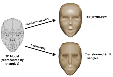 Die Truform-Technologie wurde entwickelt, um heutige 3D-Spiele noch realistischer aussehen zu lassen. Sämtliche Körper, Gesichter, Gegenstände etc. werden aus einzelnen Dreiecken (Triangles) zusammengesetzt. Meist erkennt man auch bei qualitativ hochwertigen Spielen an zum Beispiel Gesichtern noch relativ viele Ecken und Kanten. Dies entsteht dadurch, dass nicht genug Triangles benutzt werden, um das Objekt wirklich realisitschen darstellen zu können. Eben dieses Problem ist aber völlig normal, da eine hohe Anzahl an Polygonen wiederum eine hohe Bandbreite der Grafikkarte vorraussetzt, um genug Daten liefern zu können. ATIs Truform soll hier Abhilfe schaffen. Diese neue Technologie berechnet aus den bereits vorhandenen Daten noch weitere und macht das Aussehen der Objekte damit noch realistischer. Ermöglicht wird Truform dank den sogenannten "N-Patches", welche in DirectX 8.x integriert wurden. Durch diese N-Patches können Grafikkarten, welche Truform unterstützen, eben diese "fehlenden" Dreiecke berechnen und daher Objekte realistischer darstellen. Bei herkömmlichen Grafikchips, welche dies nicht unterstüzten, wird alles wie gewohnt berechnet. ATIs Radeon 8500 Chip ist bisher der erste und einzige der dies kann. Hier ein kleines Beispiel, wie es auf ATIs Homepage zu sehen ist...