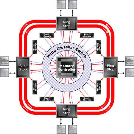 Natürlich hat ATi nicht einfach nur den Fertigungsprozess auf 90 nm gedrückt um die Leistungsaufnahme zu senken und hat parallel dazu die Taktraten nach oben geschraubt und dem ganzen den Namen Radeon X1000 gegeben. Man hat neue Features integriert und wesentliche Veränderungen an der Architektur vorgenommen. So hat man beispielsweise den Memory-Controller einem wesentlichen Update unterzogen, die externe Anbindung zu den Speicherzellen jedoch bei insgesamt 256 Bit Breite belassen. Jedoch teilen sich die 256 Bit nun zu 8x 32 Bit und nicht zu 4x 64 Bit auf. Dadurch steht nun jedem Speicherchip auf den Grafikkarten ein eigener 32 Bit breiter Kanal zur GPU bereit, was die Effizienz bei Speicherzugriffen deutlich erhöhen soll - zuvor haben sich jeweils zwei Chips einen 64 Bit Kanal geteilt. Aber nicht nur extern hat man ein wenig umgebaut: Innerhalb der neuen X1000-GPUs kommt ein so genannter Ring-Bus Controller zum Einsatz, welcher für die interne Verteilung bzw. den Datentransfer zwischen Speicher und Architektur zuständig ist. Dabei setzt die Ring-Bus Technik auf volle Bidirektionalität und kann sowohl "hin", als auch "zurück", mit maximaler breite des externen Interface übertragen. In der Praxis bedeutet dies für die X1800 Serie einen 512 Bit Ring-Bus (256 Bit in jede Richtung) und für X1600/1300 einen 256 Bit Ring (128 Bit bidirektional). Durch den Ring-Bus Controller sollen die Latenzen weiter sinken und die Effizienz und Performance von Speicheroperationen deutlich steigen.