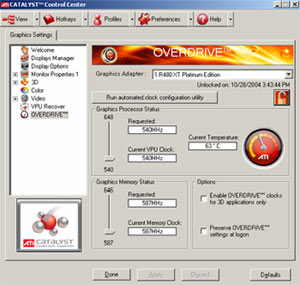 Gleichzeitig mit der neuen ATi Radeon X850 Serie führt man auch die mittlerweile dritte Generation von Overdrive ein. Overdrive dient zum automatischen Übertakten der Karte – dynamisches Anheben des Kerntaktes in Abhängig von Chipqualität und Umgebungstemperatur. Bereits bei ATis Radeon X800 XT und XT Platinum Edition Modellen konnte man Overdrive in Aktion sehen, auch wenn die Taktsteigerung eher vernachlässigbar war. Deutlich aggressiver geht hier Overdrive 3, welches bei X850 XT und X850 XT PE zum Einsatz kommt, an den Start, was man auch an der brachialen Kühlung der X850 Serie erkennen kann.
