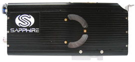 Auf den ersten Blick mag man gar nicht glauben, dass Hersteller Sapphire in gemeinsamer Entwicklung mit Kühlungsspezialist Thermaltake eine gesamte Wasserkühlung auf die Größe einer herkömmlichen Add-In-Karte geschrumpft hat, doch auch das nähere Hinsehen lässt keine Zweifel daran aufkommen. Die gesamte Konstruktion beherbergt einen Ausgleichsbehälter, eine 12V Mini-Pumpe und einen massiven Radiator - Installation via Slot-Bracket und PCI-kompatible Steckverbindung. Letzterer ist an die metallische Seite des Toxic-Gehäuses gekoppelt und erhält damit eine weitere Abfuhrmöglichkeit für die entwickelte Wärme. Inmitten des ganzen finden wir einen LED-Lüfter (Farbe: blau), der sich in zwei verschiedenen Stufen betreiben. Zwei Betriebsdrehzahlen ermöglichen wahlweise leiseren Betrieb oder höhere Leistung: 18 dBA bei 2000 U/Min bzw. 26 dBA bei 2500 U/Min. Als Redakteur und Anwender hätten wir uns an dieser Stelle eine stufenlose Regelung gewünscht - versierte Bastler und Hobby-Elektroniker können hier jedoch problemlos noch nachbessern und perönliche Vorlieben ins Spiel bringen.