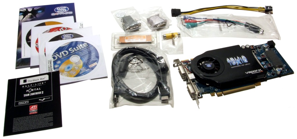 Unser heutiger Proband aus dem Hause Sapphire wartet mit einem in dieser Preisklasse ungewöhnlichen Lieferumfang auf. Hardwareseitig finden wir in der Verpackung neben der Karte einen PCI-Express Stromadapter, einen DVI-zu-VGA Adapter, einen HDMI-Adapter, ein RGB-Kabel, ein HDMI-Kabel, eine CrossFire-Bridge sowie einen S-Video Adapter. Softwareseitig hat man sich ebenfalls nicht lumpen lassen und legt neben einer Treiber-CD zusätzlich Cyberlink PowerDVD 7, Cyberlink DVDSuite, eine Vollversion von 3DMark06 und als besonderes Schmankerl einen Gutschein für die HL² BlackBox bei. Dabei handelt es sich um eine abgespeckte, nicht im Handel erhältliche Variante der bekannten OrangeBox, die neben Episode 2 auch Portal und Team Fortress 2 enthält. Hinzu kommt noch ein Handbuch, das den Einbau der Karte und die Treiberinstallation beschreibt. Alles in allem ist das ein sehr üppiger Lieferumfang, der in dieser Preisklasse keineswegs selbstverständlich ist.