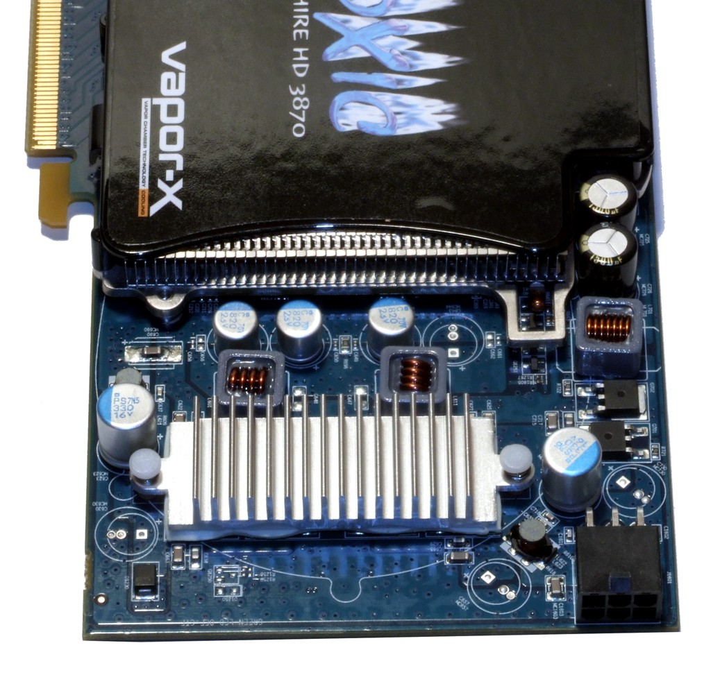 Der Radiallüfter, der Kühler für die Spannungswandler und der Stromanschluss der HD 3870 Toxic.