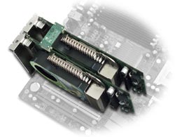 Wie wir bereits wissen, benötigt eine GeForce 6 bzw. Quadro Grafikkarte nicht gerade wenig Strom, wobei eine Quadro noch deutlich sparsamer ist. Daher ist natürlich auch die Abwärme ein springender Punkt, da sich die Zahl der Hitzeherde nun weiter erhöht. Somit werden hier in Zukunft auch verbesserte Gehäusekühlungen zum Einsatz kommen müssen, ganz abgesehen vom enormen Leistungshunger des Systems, speziell bei zwei GeForce 6800 GT/Ultra Karten. Zudem können wir auch gespannt sein, wie sich die beiden Grafikboliden untereinander Temperaturprobleme bereiten, da zwei GeForce 6 Platinen direkt übereinander sitzen und nur wenige Millimeter zwischen dem Kühler der ersten und der Platine der zweiten Karte liegen. Jedoch wollen wir uns an dieser Stelle nicht weiter in Spekulationen stürzen, sondern auf weitere Informationen in den nächsten Wochen hoffen.