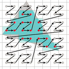 Eine der wesentlichen Änderungen ist natürlich die Aufstockung der Anzahl der Vertex-Shader von sechs (GeForce 6 Serie) auf nun insgesamt acht Einheiten. Prinzipiell sind die Vertex-Shader für das Füttern der so genannten "Triangle Setup Unit" zuständig, welche die ankommenden Triangles (Dreiecke) zeilenweise rastert und für die weiteren Renderingstufen aufbereitet. Vereinfacht lässt sich die Steigerung der Vertex-Shader-Anzahl nach dem Prinzip "viel hilft viel" abstempeln. Das Bild rechts zeigt ein solches Dreieck, wie es von der "Triangle Setup Unit" gerastert werden könnte (die Skizze entspricht nicht dem tatsächlichen Vorgehen der Nvidia GeForce 7800 GTX GPU).