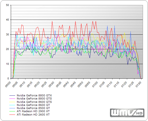 Ein wichtiger Punkt in unserem Benchmarkparcour ist auch die HDTV-Wiedergabe. So testeten wir, ob bzw. wie gut unsere Kandidaten WMV-Videos in HDTV-Qualität beschleunigen können. Aus dem folgendem Diagramm lässt sich allerdings deutlich erkennen, dass beide Kontrahenten - namentlich Nvidia und ATi - ihre Hausaufgaben ordentlich erledigt haben. Für die Wiedergabe im Windows Media Player 11 nutzten wir ein WMV-HD-Video von Microsoft (Journey Into Amazing Caves) mit einer Spieldauer von 1:25 Minuten.
