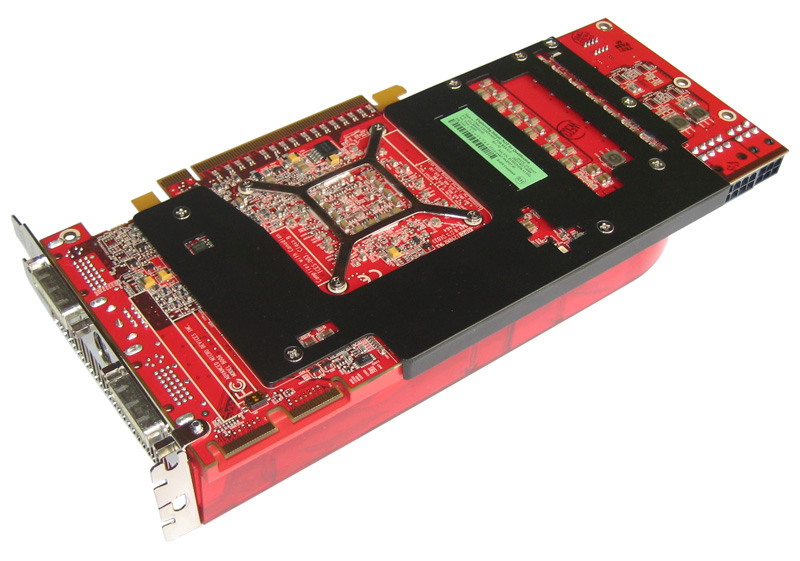 Erinnern wir uns an die ersten Spekulationen um das Design des R600 zurück, läuft es uns jetzt noch eiskalt den Rücken herunter! Dieses Design hat sich Gott sei Dank nicht bewahrheitet und die Radeon HD 2900 XT ist deutlich schlanker ausgefallen als erwartet. Konkret ist sie ein wenig kürzer als eine 8800 GTX von Nvidia, benötigt aufgrund der Bauhöhe der Kühlung aber dennoch zwei Slots. Neu sind auch die Stromanschlüsse, da die Karte über einen 8-poligen PCI Express 2.0 Anschluss verfügt. Zwar sind für den Betrieb zwei herkömmliche 6-Pol PCIe-Stecker ausreichend, doch kann Overdrive nur bei voller Bestückung mit 1x 8-Pol + 1x 6-Pol genutzt werden. Auch das manuelle Overclocking setzt ein Netzteil mit neuem PCIe 2.0 Verkabelung voraus.