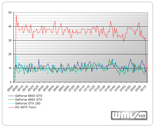 Ein wichtiger Punkt in unserem Benchmarkparcour ist auch die HDTV-Wiedergabe. So testeten wir, ob bzw. wie gut unsere Kandidaten WMV-Videos in HDTV-Qualität beschleunigen können. Aus dem folgendem Diagramm lässt sich deutlich erkennen, dass Hersteller Nvidia seine Hausaufgaben ordentlich erledigt hat. Für die Wiedergabe im Windows Media Player 11 nutzten wir ein WMV-HD-Video von Microsoft (To the limit) mit einer Spieldauer von 2:10 Minuten.