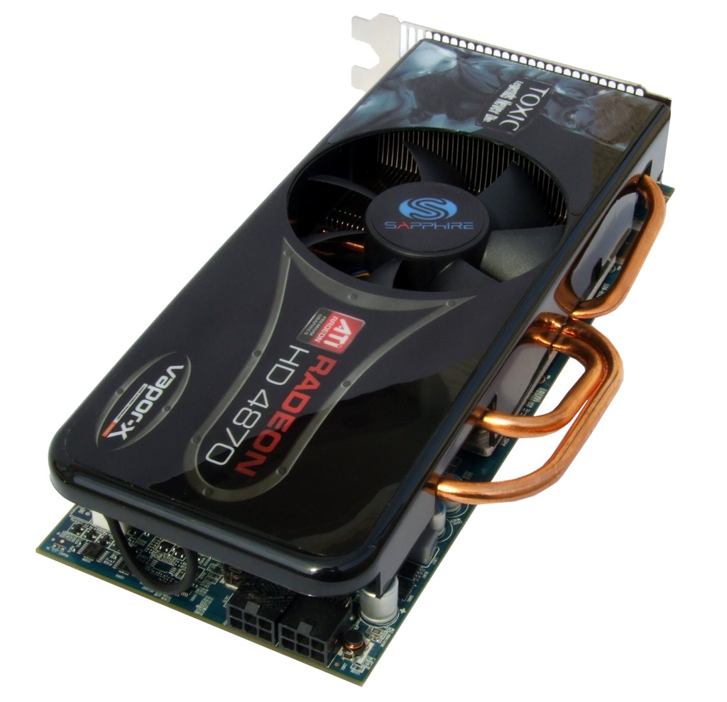 Vorder- und Rückseite der HD 4870 Toxic. Deutlich zu erkennen sind auch die beiden Bridge-Steckplätze für die CrossFireX-Funktion der HD 4870 sowie die Heatpipes des Vapor X-Chambers.