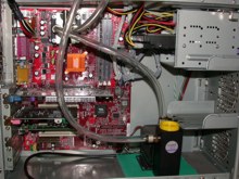 Der CPU-Wasserkühler in montiertem Zustand auf dem Sockel und die Schlauchführung bzw. Annordnung der Pumpe im Gehäuse.