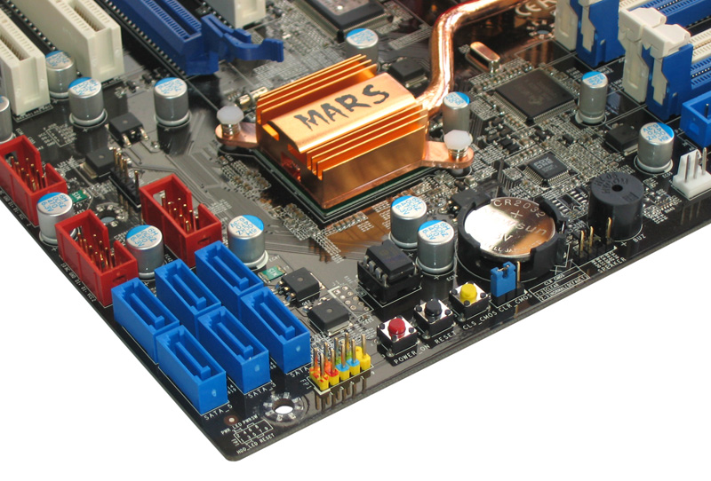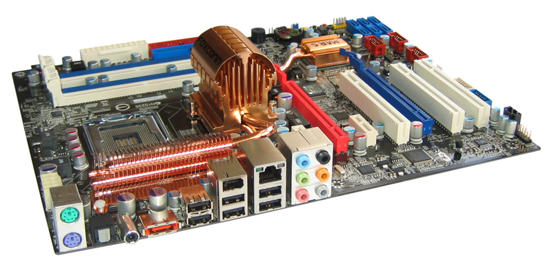 Foxconn will mit MARS ein Mainboard ohne Kompromisse anbieten und verfolgt diese Philosophie auch in Sachen Lieferumfang. Neben diversen Handbüchern, Anleitungen und Datenträgern mit Treibern und Software, finden wir Aufkleber und eine Halskette im Armee-Style im Lieferumfang. Zu den wichtigeren Accessoirs zählen wir das I/O-Shield für das Back-Panel, je ein IDE- und Floppy-Datenkabel, ein Slotbracket für 2x USB 2.0 und FireWire (passive Ausführung), ein optionaler Lüfter für die P35-Northbridge, sechs Molex-SATA-Stromadapter, sowie sechs SATA-Datenkabel. Bei den SATA-Datenkabeln hat Foxconn vier herkömmliche Versionen und zwei mit je einem abgewinkelten Ende beigelegt. Ein sehr üppiger Lieferumfang mit netten Gimmicks, der perfekt gewesen wäre, wenn wir noch ein Slotbracket für die Stromversorgung von externen eSATA-Laufwerken im Karton gefunden hätten.