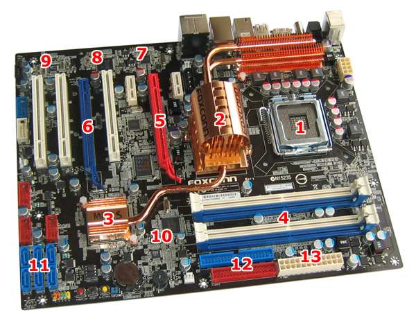 Im unteren Mainboardbereich befinden sich die Erweiterungsslots, die Southbridge, die Front-Panel-Anschlüsse, satte sechs SATA2-Ports sowie Pins für die externen USB- und FireWire-Ports sowie den COM-Header. Die drei Buttons für das Starten und Neustarten bzw. den CMOS-Clear hat man ebenfalls im unteren Teil, direkt neben dem FP-Header, platziert. Intelligent ist außerdem die Aufteilung der PCI- und PCIe-Slots: Auch beim Einsatz von zwei Dual-Slot-Grafikkarten im Multi-GPU-Betrieb bleiben zwei PCI- und ein PCI Express x1-Steckplatz verfügbar. Auf der folgenden Grafik haben wir nochmals alle wichtigen Stellen auf der Platine markiert und geben gleichzeitig einen kleine Übersicht zur Platzierung der einzelnen Chips und Funktionalitäten auf dem MARS von Foxconn.