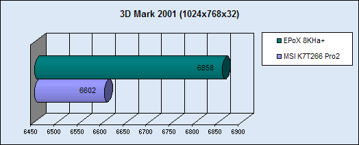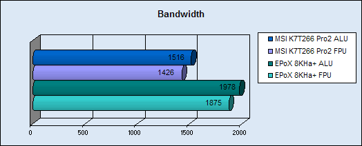 Das Mainboard ist sehr schnell, und vor allem im Bandwidth Test sieht man große Unterscheide zum MSI K7T266 Pro2. Aber auch in anderen Tests, wie zum Beispiel in der 3D Performance sieht man deutliche Unterschiede, die schon eine enormes Ausmaß haben, so ist das Testsystem mit fast 500 Punkten schneller was allein auf das Mainboard zurückzuführen ist. Als drittes Benchmark haben wir uns für das Packen einer 133 MB großen Datei entschieden um die alltags Performance zu testen. Auch hier sieht man, dass das Epox um ganze 12 sec schneller fertig ist. Und in allen Benchmarks das MSI K7T266 Pro 2 deklassiert wird.