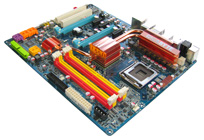 Mit zum oberen Mainboardteil gehört auch das Back-Panel, das eigentlich alle auf dem Board verfügbaren Anschlüsse, abgesehen von eSATA, nach außen schleift. So finden wir folgende Schnittstellen: PS/2 für Tastatur und Maus, Digital-Audio via Chinch und optischem Leiter, FireWire 400 (passive und aktive Variante), 2x RJ45 Gigabit-Ethernet, sowie 8x USB 2.0. Für die übrigen FireWire- und USB-Ports werden Slotbrackets benötigt oder können an das Front-Panel angeschlossen werden. Die auf dem Board verfügbaren seriellen COM- und parallelen LPT-Ports hat man nicht am Back-Panel umgesetzt - ein Slotbracket fehlt ebenso.