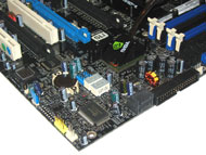 Ebenfalls in der oberen Boardhälfte befindet sich das Back-Panel (siehe Bild unten Mitte) mit direkt verdrahteten Anschlüssen für die PC-Rückseite. Von den insgesamt zehn USB 2.0-Ports hat EVGA hier direkt sechs Stück nach Außen geführt und auch einen der beiden FireWire-Anschlüsse integriert. Komplettiert wird das Ganze von den Audio-Anschlüssen samt optischem Ausgang, zwei PS/2-Ports für Maus und Tastatur sowie zwei Mal Gigabit-Ethernet. Der Serial-Port wird durch ein Slot-Bracket realisiert.