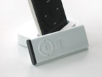 ...über die der kleine iPod mit der ebenfalls optional erhältlichen Apple Remote Fernbedienung kommunizieren kann. Wenn man den iPod zu Hause an die Stereoanlage oder an einen Fernseher anschließt, lässt sich mit Apple Remote der gesamte Inhalt des Players bequem vom Sessel aus steuern. Für die Steuerung von Musik, Diashows, Videos etc. stehen die Eingabeelemente Play/Pause, Spulen/Weiter und Volume (+/-) zur Verfügung (die Menü-Taste ist lediglich für die Kommunikation mit Front Row bzw. den Apple iMac-Geräten).