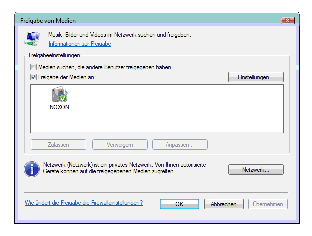 Die Einbindung des NOXON unter Windows Vista stellt den Anwender vor keine nennenswerten Probleme und daher können wir diesen Abschnitt kurz halten. Der in Vista integrierte Medienserver erkennt den NOXON sofort und ohne weitere Einstellungen als externen UPnP-Player und öffnet ein entsprechendes Dialogfeld, in dem das Gerät erscheint und der Nutzer aufgefordert wird, entsprechende Dateien freizugeben. Diese werden vom NOXON auch sofort klaglos erkannt. Die Installation bestimmter Software oder gar die Konfiguration entfällt also komplett. Komfortabler geht es kaum, zumal diese Art der Medienfreigabe auch ungeübten Anwendern kaum Probleme machen sollte. Wie wir festgestellt haben, funktioniert das Ganze unter Windows 7 Beta ebenfalls auf diese Art, so dass die Zukunftssicherheit des iRadio Cube zumindest unter Windows-Plattformen auch künftig gewährleistet ist.