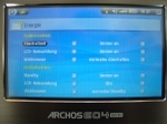 Beim Einschalten des Gerätes wird man mit dem Archos Logo begrüßt. Mit den zwei Symbolen links oben kann man zwischen Multimedia und Gerätemanagement wechseln. Im Multimediabereich stehen Anwendungen für Video, Musik, Foto, Internet, Browser, Fortsetzen der letzten Anwendung, AudioCorder, Aufnahmeplan und Videocorder zur Verfügung, wobei die letzten beiden Applikationen nur durch die optional erhältliche DVR-Station funktionieren. Im Gerätemanagementmenü ist es möglich mit den Icons Sprache, Bildschirm, Darstellung, Datum und Uhrzeit, Energie, TV-Steuerung, System und Datenfreigabe den Archos 604 WiFi zu konfigurieren. Die Icons in der rechten oberen Ecke geben den Klang, die aktuelle Lautstärke sowie den Batteriezustand und die Uhrzeit an. Der Stift zum Bedienen des Gerätes wird nicht im Archos 604 WiFi verstaut, sondern findet in der Schutztasche Platz. Natürlich ist auch eine Bedienung mit den Fingern möglich, doch wenn das Display sauber bleiben soll, dann ist zu empfehlen immer die Schutztasche mitzuführen.