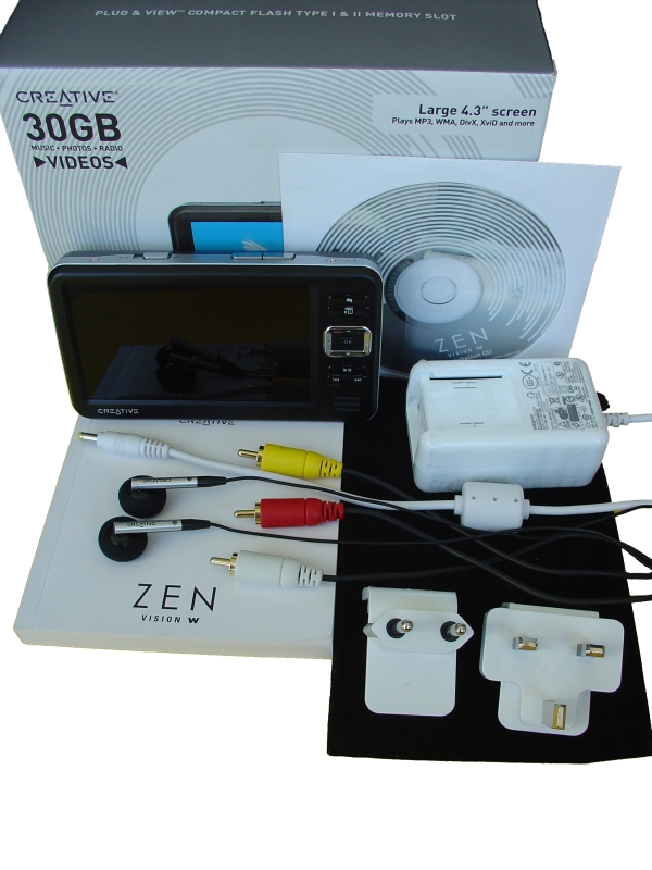 Der Lieferumfang ist sehr großzügig gestaltet: Es befindet sich neben einer Tasche aus schwarzem Samt ein USB-Kabel, ein A/V-Kabel, ein Stereokopfhörer und auch ein Netzteil, welches mit zwei verschiedenen Steckern ausgestattet werden kann, im Karton. Dieses Feature findet man nicht bei allen Geräten am Markt. Die Verarbeitung ist sehr gut gelungen und auch die Bedienung des Multimedia-Players lässt keine Wünsche offen. Auf dem Widescreen-Display mit einer Auflösung von 480 x 272 Pixel lässt es sich bequem zwischendurch Filme betrachten, auch wenn man in der Reaktionszeit kleine Abstriche machen muss. Als MP3-Player überrascht der Player durch eine Akkulaufzeit von über 11 Stunden. Es gab beim Testen des Protablen Multimedia Players keine Probleme, weder mit der Hardware noch Software, abgesehen von der fehlenden Windows Vista Kompatiblität. Creative bietet auf seiner Homepage auch Firmareupdates für seinen Zen Vision W, damit der Player stets auf dem aktuellen Stand bleibt.