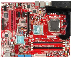 Aus Intels PCI Express Chipsatz Generation möchten wir Ihnen gleich drei Boards vorstellen, da die Chipsätze doch mittlerweile sehr vielfältig sind und wir doch alle Preisklassen abdecken wollen. Beginnen wir mit dem absoluten High-End Bereich für Pentium 4 Extreme Edition Prozessoren mit einem Front Side Bus von 1.066 MHz. Hier heißt unser Favorit Fatal1ty AA8XE von Hersteller Abit (Bild links unten). Das Abit Fatal1ty AA8XE ist mit i925XE Alderwood Chipsatz ausgestattet und unterstützt daher Bustakte bis zu 266 bzw. 1.066 MHz (QDR). Des weiteren befinden sich vier Serial-ATA Kanäle auf dem Mainboard, die als RAID 0 oder 1 nutzbar sind. Außerdem ist das Mainboard mit Firewire, 8-Kanal HD Sound, Gigabit-LAN und einer 10/100 MBit Netzwerkkarte ausgestattet. Zusätzlich befinden sich das von Abit entwickelte OTES-System auf dem Board, welches gleich durch zwei 40 mm Lüfter mit Frischluft versorgt wird. Zusammenfassend ist das Board wird High-End pur und kostet daher auch recht viel: 220 Euro.