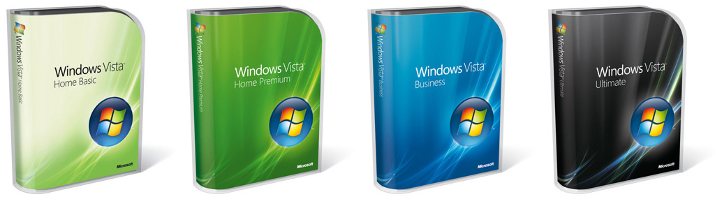 Die Verpackungen von Windows Vista Home Basic, Home Premium,