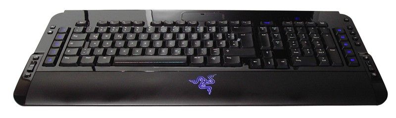 Nachdem man die Tarantula von ihrer aufwändigen Verpackung befreit hat, fällt zunächst das Zubehör auf: Der Tastatur sind zehn zusätzliche Tasten beigelegt, mit denen man bei Bedarf einen Teil der Standard-Tasten austauschen kann. Daneben gibt es ein Werkzeug, das sowohl dem Austausch der Tasten als der Entfernung der Abdeckung für das ‚Battle Dock’, einem Anschluss für spezielles Razer-Zubehör, dient. Dazu kommen wir im Verlauf dieses Artikels allerdings noch. Die Tarantula ist rein äußerlich eher konventionell gehalten, da sie eine streng rechteckige Bauform aufweist. Lediglich die Ecken und Kanten sind deutlich abgerundet. Insgesamt fällt auf, dass die Tarantula sehr wertig gemacht ist. Der größte Teil des Tastaturgehäuses kommt im schwarz glänzenden Klavierlack-Look daher. Lediglich die Tasten und die Handballenablage sind matt gehalten. Die Abdeckung für das Battle Dock wirkt dagegen nicht ganz so hochwertig, obwohl auch sie im Glanz-Look gehalten ist. Ein elementarer Nachteil dieser Optik ist allerdings, dass die Tarantula extrem anfällig für Staubablagerungen und Fingerabdrücke ist. Jede Bedienung hinterlässt deutliche Spuren, was die anfangs makellose Optik schnell unschön aussehen lässt. Die insgesamt 105 im Neuzustand sehr weich arbeitenden Tasten entsprechen weitgehend den Standardabmaßen, mit allerdings etwas kleiner gehaltenen F-Tasten. Monieren muss man hier allerdings, dass die Tastenbeschriftungen lediglich aufgeklebt sind. Gerade bei Gaming-Tastaturen, bei denen häufig nur wenige Tasten benutzt werden, diese dafür aber häufig, ist das ein echtes Manko, denn auf lange Sicht wird sich die Beklebung abnutzen. Tasten mit Laserbeschriftung wären hier besser gewesen. Auf die normalen Windows-Tasten hat man bei Razer verzichtet und stattdessen die linke der beiden mit der Aufschrift ‚Start’ versehen (wobei die Funktion gleich geblieben ist). Die rechte Taste ziert ein Razer-Logo, das wahlweise mit der Funktion des Menüaufrufs oder der Option, der Razer-Treiber zu öffnen, belegt werden kann.