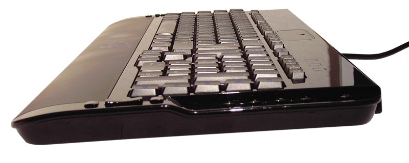 Darüber hinaus ist die Tastatur an der Rückseite mit zwei USB-Anschlüssen ausgestattet, die allerdings nur den USB 1.1-Standard unterstützen. Zusätzlich finden wir zwei handelsübliche 3,5 mm-Buchsen für Kopfhörer und Mikrofon, die ebenfalls an der Rückseite neben den USB-Anschlüssen angeordnet sind. Die Realisierung der Anschlüsse am Rechner wird über ein ausreichend langes, einteiliges Kabel ausgeführt, das sich erst zum Ende hin in die beiden USB-Stecker für die Tastatur und den Hub sowie Mikrofon- und Kopfhöreranschluss verzweigt. Somit hat man hier also eine recht aufgeräumte Lösung vor sich.
