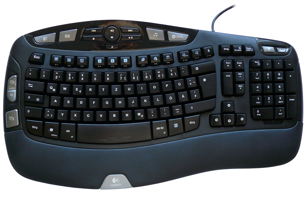 Nummer drei unseres Tests ist die Logitech Wave Tastatur. Mit einer unverbindlichen Preisempfehlung von 49,99 Euro gehört sie in die obere Preisklasse unserer verschiedenen Testkandidaten. Neben mehreren Tastaturen mit geteiltem Layout, die allerdings nur in Form von Desktop Sets, also im Bundle mit Mäusen, zu kaufen sind, ist sie die einzige von Logitech erhältliche Tastatur, die auf natürliche Handhaltung ausgelegt ist.