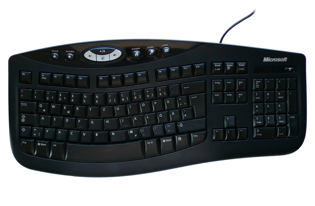 Der Lieferumfang dieser Tastatur ist wieder der Preisklasse entsprechend. Sie kommt ohne Treiber-CD daher, hat diese aber auch nicht notwendig. Die ganz in Schwarz gehaltene Tastatur macht einen dezenten Eindruck. Die Qualität ist für diese Preisklasse erstklassig und erlaubt sich keine Mängel. Sie ist laut Hersteller sogar spritzwassergeschützt, was wir in unserem Test aber nicht näher untersuchen wollten. Das Besondere dieser Tastatur ist das angewinkelte Tastaturlayout. Dieser Winkel von 6° findet auch in anderen, teureren Tastaturen Microsofts Verwendung.