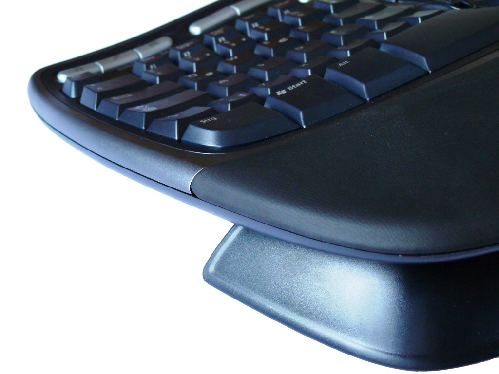 Der Lieferumfang dieser Tastatur ist Standard, die Treiber auf der CD sind allerdings nicht mehr aktuell. Für die Verwendung unter Windows Vista müssen neue Treiber heruntergeladen werden. Da die Packung der Tastatur ein Windows Vista-Zertifikat aufweist, hat uns das einigermaßen verwundert. Beim ersten Blick auf die Tastatur sticht das bereits erwähnte geteilte Tastaturlayout ins Auge. Doch dies ist nicht die einzige Maßnahme, die Microsoft eingesetzt hat, um eine möglichst ergonomische Tastatur zu kreieren. Die Mitte des Haupttastenfeldes ist so weit angehoben, dass eine angenehm gewölbte Form entsteht. So liegen die Hände in einem Winkel von 14° nach außen gedreht zueinander. Der Grad der Teilung der Tastenfelder beträgt 24° und ist somit ideal dem Körper angepasst. Die gepolsterte Handballenauflage bettet die Hände weich auf der Tastatur. Zusätzlich lässt sich die Tastatur noch mit Hilfe der mitgelieferten Stütze um 7° nach hinten anpassen. Damit lassen sich die Arme und Hände exakt in einem Winkel von 90° vom Körper platzieren, wodurch fast alle ermüdenden und ungesunden Stellungen und Bewegungen wegfallen.