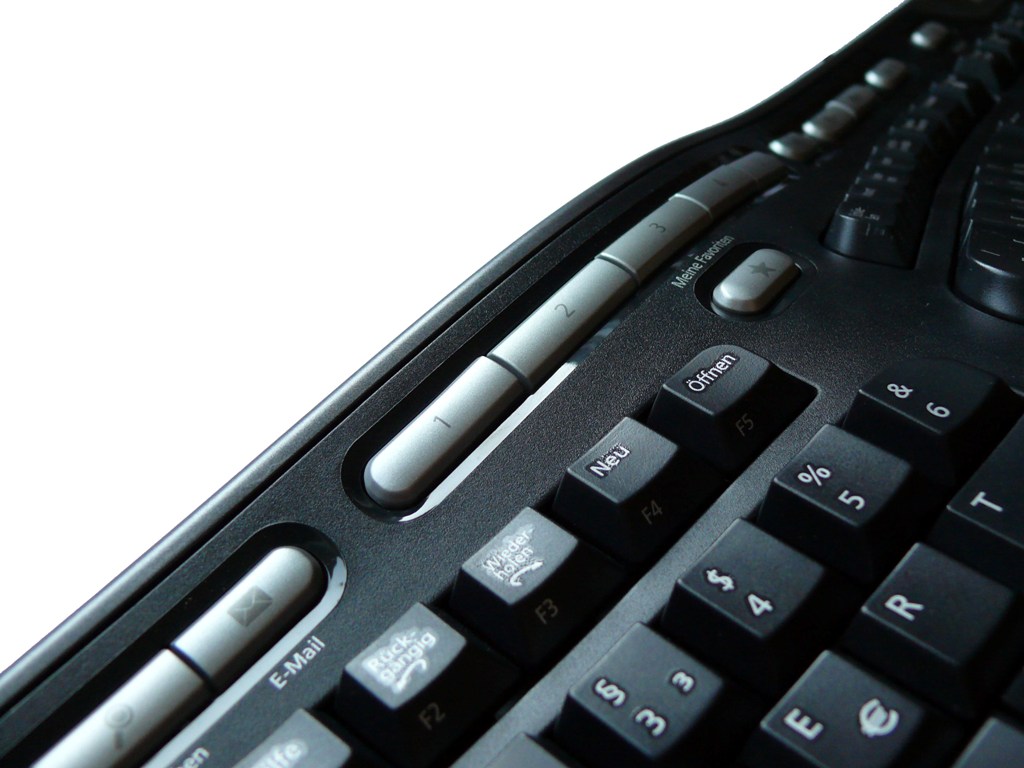 Diese Tastatur fordert durch die oben genannten Änderungen mit Abstand die größte Umgewöhnung für den Benutzer. Erfreulicherweise sind alle Tastenblöcke abgesehen vom Haupttastenblock im Standardlayout gehalten. Die F-Tasten sind allerdings nicht wie üblich in Vierergruppen angeordnet, sondern in zwei Gruppen zusammengefasst, die jeweils rechts und links der Mitte sitzen. Über dem Nummernblock gibt es eine weitere erfreuliche Neuerung. Hier sind vier herkömmliche Tasten angebracht, die die Funktionen von Klammern, Backspace und dem Gleichheitszeichen bieten und erweitern den Nummernblock so um sinnvolle Funktionen. Doch die Tastatur hat noch einiges mehr an Sondertasten zu bieten. Zwischen den zwei Haupttastenblöcken befindet sich ein Zoom-Slider und unter der Leertaste sind Tasten für Vor und Zurück angeordnet. Zwischen den F-Tasten befindet sich eine Favoritentaste mit fünf weiteren, frei belegbaren Tasten für diverse oft verwendete Dokumente oder Ähnliches. Links daneben befinden sich die bekannten Tasten für den Browser, die Suche und das E-Mailprogramm. Rechts der Favoritentasten liegen die Tasten zur Steuerung des Mediaplayers. Hier fehlen allerdings wieder wie auch schon bei der ersten Microsoft-Tastatur in unserem Test die Tasten für die Steuerung der Wiedergabeliste. Der Windows-eigene Rechner hat auch auf dieser Tastatur eine separate Taste spendiert bekommen. Weiterhin hat jede der Funktionstasten eine zusätzliche Sonderfunktion, wie wir es auch schon von der Logitech Wave Tastatur kennen. Diese lassen sich mit Hilfe der Zusatztaste neben der F12-Taste permanent ein- und ausschalten.