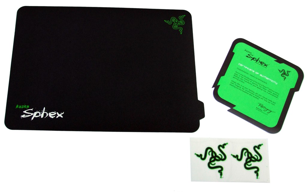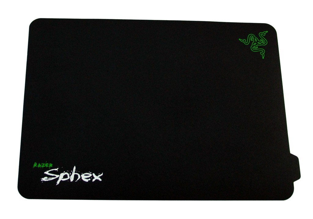 Das Mauspad wird in einer Kartonverpackung geliefert, die nach dem Öffnen leider nicht mehr verwendet werden kann, da die Perforation so schlecht funktioniert, dass die Verpackung stark darunter leidet. In die Oberseite des Kartons ist ein rundes Loch gestanzt, durch das man die Oberfläche des Pads ertasten kann. Das ist sinnvoll, denn so kann man vor dem Kauf prüfen, ob einem die Oberfläche grundsätzlich zusagt. Im Karton selbst befinden sich nur das Mauspad, ein Echtheitszertifikat sowie ein Satz Razer-Aufkleber. Zunächst ist man überrascht, wie dünn das Sphex tatsächlich ist. Es misst lediglich 0,3 mm in der Dicke und fällt mit 320 mm x 230 mm (BxL) recht klein aus, wenn man große Gaming-Pads gewohnt ist. Die Vorderseite des Pads besteht aus einem leicht rauen, strukturierten Kunststoffmaterial, wie man es etwa von den Razer Pro Pads oder der Exact Mat her kennt. Damit wäre das Pad zumindest hinsichtlich der Oberfläche also eindeutig den Hard Pads zuzurechnen. Der grundsätzliche Unterschied zu Soft Pads ist in der Oberfläche zu sehen, denn letztere haben in der Regel eine Oberfläche aus sehr glattem Stoff. Hier stellt sich also von vorne herein die Geschmacksfrage, welcher Oberflächenart man den Vorzug gibt. Weiterhin ist das Pad auf der Vorderseite mit dem Produktlogo sowie dem Razer-Logo bedruckt. Auf der rechten Seite des Pads sitzt eine Lasche, die einerseits dazu dient, das Pad leichter wieder abziehen zu können und andererseits, um die rückseitig angebrachte Schutzfolie leichter entfernen zu können. Die Rückseite wird im Auslieferungszustand von einer Schutzfolie abgedeckt, die sich sehr leicht entfernen, aber auch wieder problemlos anbringen lässt. Das ist, gerade wenn das Pad etwa zu einer LAN transportiert werden soll, sicher kein Nachteil.