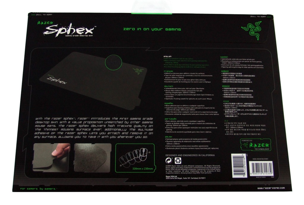 Vorder- und Rückseite der Verpackung des Razer Sphex Mauspads.